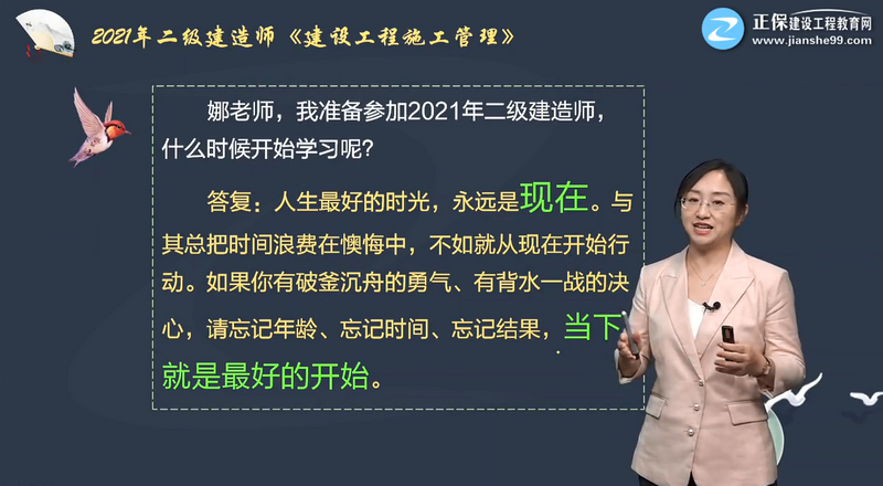 对此,网校二级建造师《建设工程施工管理》主讲老师李娜老师为我们指明了方向:当下就是最好的开始。