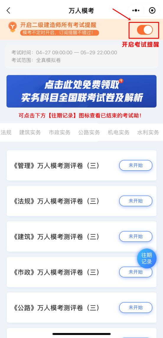 二级建造师万人模考(三)时间为4月27日 9:00-5月29日 22:00。