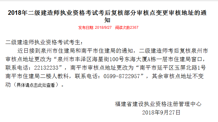 近日接到泉州市住建局和南平市住建局的通知,二级建造师考后复核泉州市审核点地址更改为“泉州市丰泽区海星街100号东海大厦A栋一层市住建局窗口,联系电话:22132233”,南平市审核点地址更改为“南平市延平区玉屏北路1号南平市住建局二楼人教科,联系电话:0599-8722957”,其余审核点地址不变动(具体请点击此处查看)。