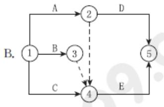 某工程有A.B.C.D.E五项工作,其逻辑关系为A.B.C完成后D开始,C完成后E才能开始。则据此绘制的双代号网络图是( )。
