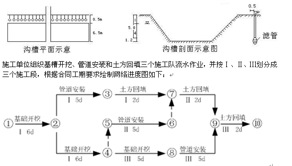 【参考答案】1.(1)降水井点布置采用单排井点不合理。沟槽深度达到5m,基坑宽度为6.5m,应采用双排井点布置。(2)井点管与基槽上口边缘距离为0.5m不合理。井点管应布置在基槽上口边缘外1.0~1.5m. 2.降水深度为基底以下0.2m不正确,降水深度应为基底以下0.5m. 3.管道安装1到管道安装2用虚线连上,箭头指向安装2.安装2指向安装3,箭头指向安装3.还有把4到5节点改成虚箭线,6到7节点改成虚箭线。