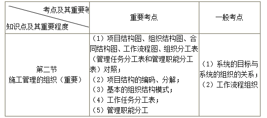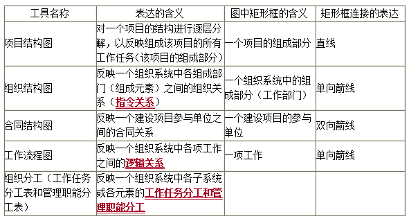 考点:项目结构图、组织结构图、合同结构图、工作流程图、组织分工表(管理任务分工表和管理职能分工表)对照: