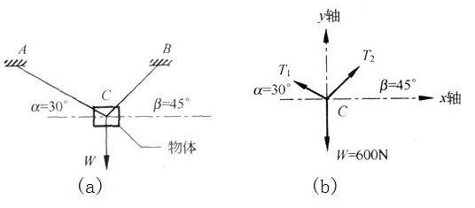 一个物体,重量为w,通过两条绳索AC和BC吊着,计算AC.BC拉力的步骤为: