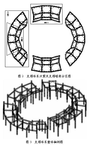 答:国家体育场(鸟巢)屋盖钢结构支撑塔架的柱身选用3×3m格构柱,为提高支撑塔架的整体刚度和稳定性,在支撑塔架的顶部设置水平支撑体系,支撑体系仍采用格构式桁架结构。为提高水平支撑体系的抗扭刚度,在其角部区域设置隅撑,支撑塔架的柱脚与基础采用刚接。根据主结构的安装方案,将整体支撑塔架分成四大块,长短轴各两个区块,并将这四区块所有支撑塔架连成整体。这个方案符合主桁架安装、形成自受力体系的过程,方案如下图所示: