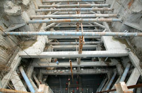 再然后呢,就要根据地下勘察的情况、地面交通的情况、国家规范、还有其他的一些约束条件,做出设计,然后把线路分成很多段,分标段招投标,等等;这里就不提供延展阅读的材料了。再再然后呢,就开始修了。地铁一般分成两种标段,一个是车站,一个是区间。车站其实就是类似高高的楼房的基础一样,所以跟深基坑的开挖方法类似,大家一般看到的在马路上围起来的,都是修车站啦。用的方法,专业术语叫明挖法,就是围起来,开始挖,一边挖一边把坑边支撑起来,分层往下挖。