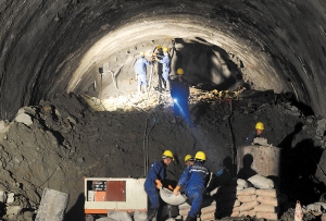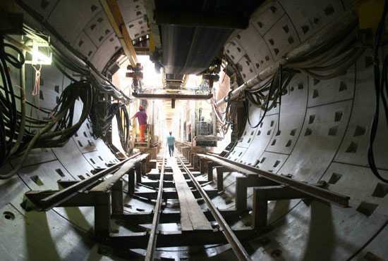 上图是一个典型的地铁车站施工现场照片。可以看到它的四周“墙壁”是呈现混凝土的材质。应该是采用混凝土喷锚支护的。画面中的圆柱形大管子就是钢支撑,它撑住侧壁不会倾覆。然后左右下角还有方形的斜撑,这些是混凝土支撑。区间就是站与站之间的隧道。一般在车站这个深基坑挖得差不多深度之后,从这个坑里再开始挖隧道。这里面一般有两种方法,一种叫“矿山法”,就是跟采矿似的,由人进去,先爆破或用机械挖开,赶紧支撑好,然后精挖至设计的尺寸,撑第二道,再做装修等等;第二种方法就是前面提到的“盾构法”,是用巨大的机器来做,机器自己挖,自己撑,自己把土运出去。