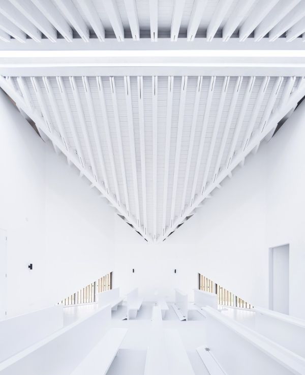 “光线”在教堂空间的宗教表达方式上是一项重要主题。在这个特殊的设计里,光线从圣坛轴线上方的带状采光天窗中透入,洒落在大堂中央,另外还从圣坛墙上的圣十字架背后透入。这300毫米宽的光带的展示是室内空间最强有力的界定元素。其余的自然光线柔和地透过木板条落到了墙上的洞口中。