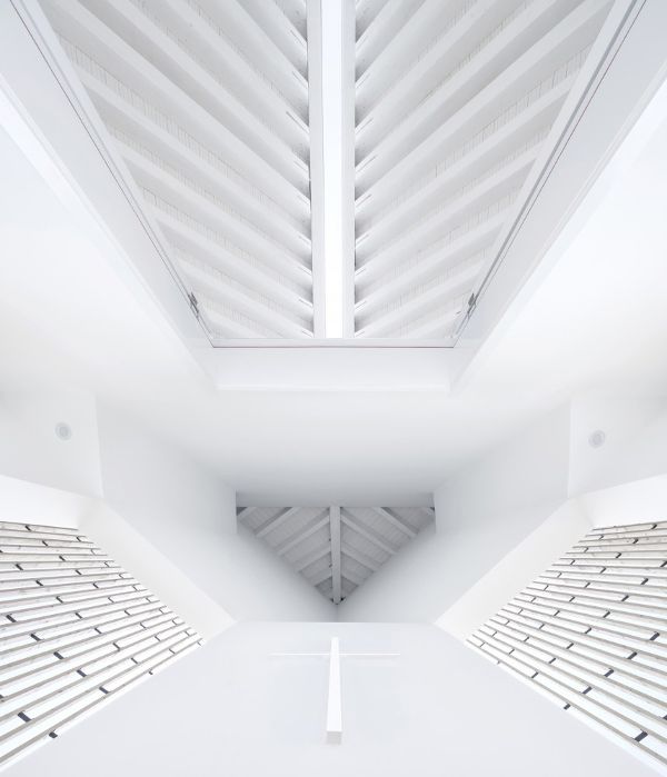 在万景园教堂的设计中,建筑师并未有意拒绝“向心性”和“深度感”这种传统的空间序列。在平面设计上,有一个八角形的中央礼堂,四周环绕着方形的廊道。在剖面图上看,屋顶外形与如细长狭缝一样的采光天窗的运用都放大了空间的纵深感,凸显了这个神圣空间的最高点,这里也是所有轴线相交之处。