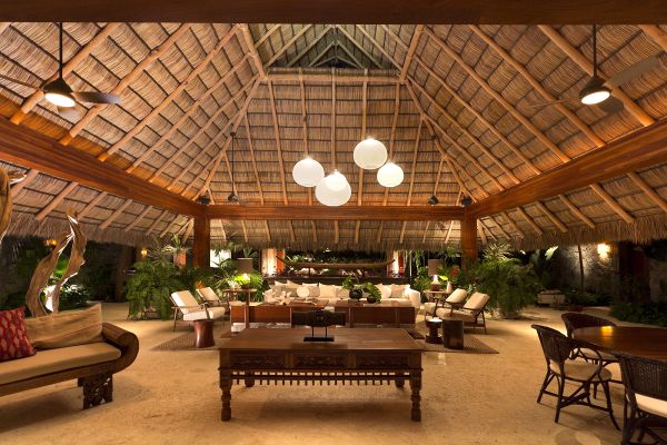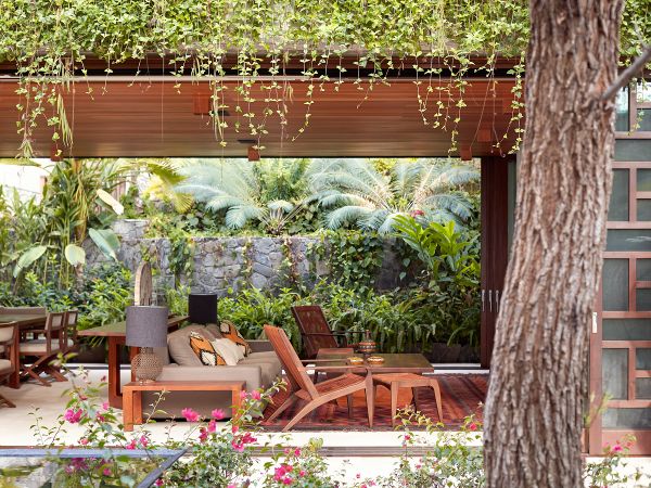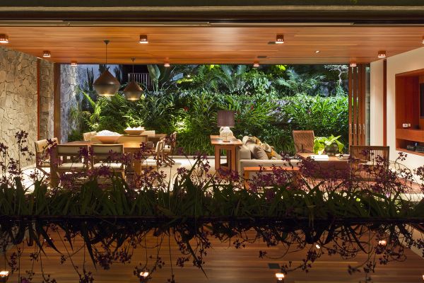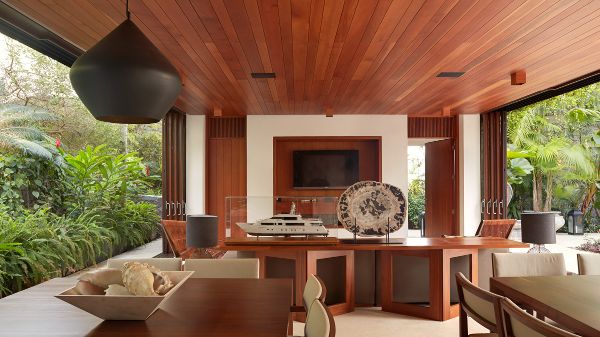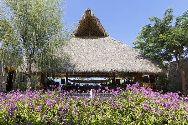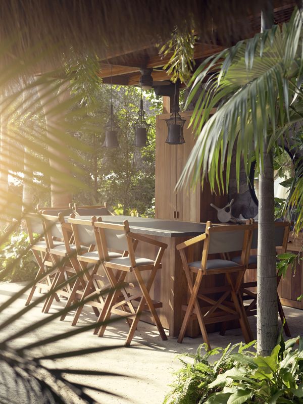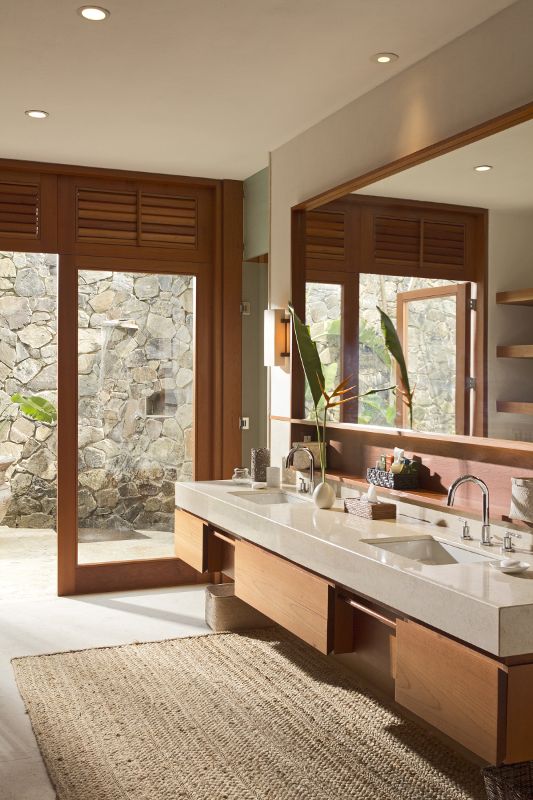 所使用的材料包括从山上开采来的石头,用于建造主要平台和墙体。出于结构原因,专门给裸露混凝土进行了“喷砂”处理。柱子和梁都是用经过认证的森林出产的层压木材做成的。采用雪松木制品是因为它适应当地气候,气味也芳香怡人。对于户外屋顶,我们用了木材和当地的棕榈树。室内地面用的是“喷砂”大理石(为获得光滑而防滑的纹理),而室外地面用的是“卡罗兰”石,因为它热容量高,让人在屋内屋外都可以赤足行走。