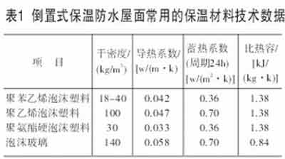 保温材料应选用高热绝缘系数、低吸水率的新型材料,如聚苯乙烯泡沫塑料、聚乙烯泡沫塑料、聚氨酯泡沫塑料、泡沫玻璃等,也可选用蓄热系数和热绝缘系数都较大的水泥聚苯乙烯复合板等保温材料。倒置式保温防水屋面常用的保温材料技术数据见表1。