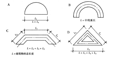 3.按建筑设计防火规范,建筑物长度计算的平面简图(如下图),其中哪个是正确的( )。