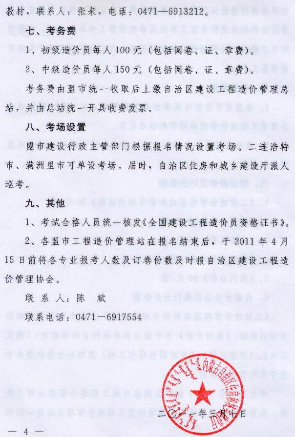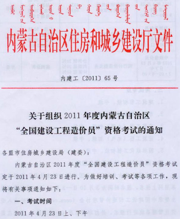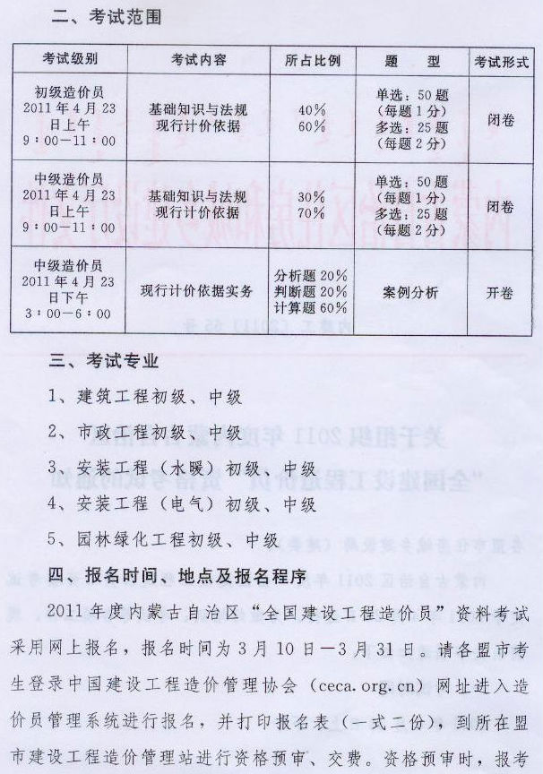 2011年内蒙古造价员考试报名时间为3月10日-31日