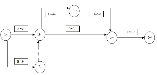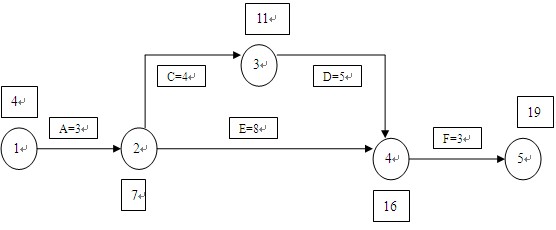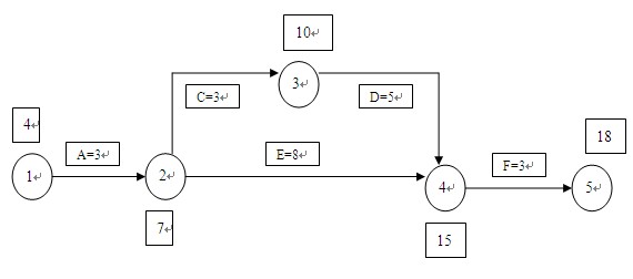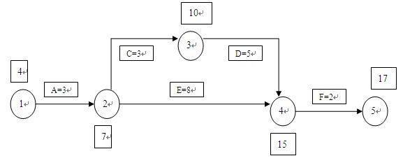 (2)第二次优化。可压缩的工作有C.D.E.F.选择费用率最低的工作F进行压缩,将其压缩1个月,增加费用5万元,计算工期为17个月。关键线路:①→②→③→④→⑤和①→②→④→⑤。见下图。