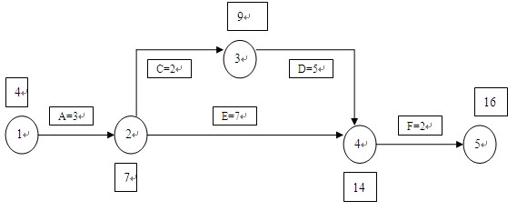 (3)第三次优化。可压缩的工作有C.D.E.选择费用率最低的工作C和E进行压缩,将其各压缩1个月,增加费用6万元,计算工期为16个月,已经满足要求。