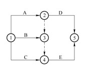 5.已知某工程双代号网络图如下图所示,由A、B、C、D、E五项工作组成。该网络图中,E工作的紧前工作为( )。