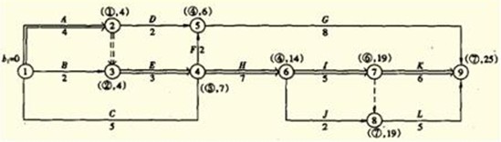 施工过程H、I、K进行流水施工以后,原关键线路A→E→H→I→K的总持续时间为(4+3+2+11)月=20关键线路发生变化,新的关键线路有两条,即线路A→E→H→J→L和线路A→E→H→I→L,计算工期都等于23个月(分别4+3+2+4+5+5=23;4+3+2+7+2+5=23),满足合同工期要求。