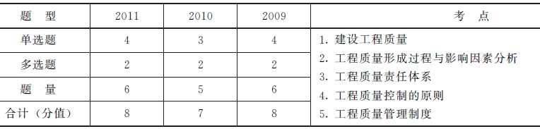 根据历年的考试情况来看,本章在试题中所占分值在8分左右。考生需着重掌握的内容:工程质量的特性、工程质量责任体系、工程质量管理制度以及监理工程师在质量控制中应遵循的原则。本章是本书的基础知识,考生要对本章中的工程质量和质量控制的概念以及工程质量管理制度有一个明确的理解。