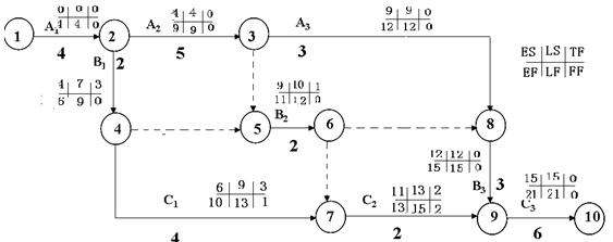 (3)本例中的关键线路为①-②-③-⑧-⑨-⑩。因为工序A1、A2、A3、B3、C3的总时差均为0,是本工程的关键工作,将关键工作依次相连所形成的通路就是关键线路。