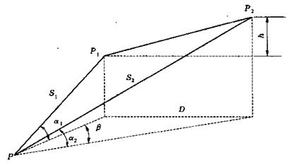 在与P1、P2通视的任一点P上安置全站仪,首先观测P至P1、P2的斜距S1、S2,竖直角α1、α2,以及PP1至PP2间的水平夹角β,然后可由余弦公式计算P1P2的平距D和高差h: