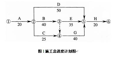 [例1]某建设单位和施工单位按照《建设工程施工合同(示范文本)》签订了施工合同,合同中约定建筑材料由建设单位提供,由于非施工单位原因造成的停工,机械补偿费为200元/台班,人工补偿费为50元/日工;总工期为120天;竣工时间提前奖励为3000元/天,误期损失赔偿费为5000元/天。经项目监理机构批准的施工进度计划如图1所示(单位:天)。