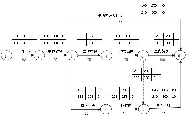 【答案解析】本题实质就是计算该网络计划的工期。计算得到的最早开始时间、最早完成时间、最迟开始时间、最迟完成时间、总时差和自由时差。由图可知计划工期是300天。由于该网络计划图较简单,也可以分别计算四条线路的持续时间,关键线路的长就是计划工期。参见教材P127.