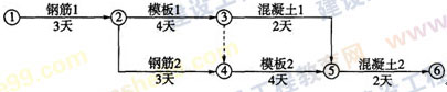 场景(五)某工程为框架结构办公楼,第二层现浇钢筋混凝土柱有钢筋、模板和混凝土3道施工工序,在平面上分为两个施工区域组织搭接施工,承包商对其进度计划安排如下列双代号网络图所示。