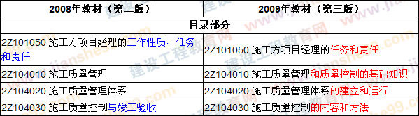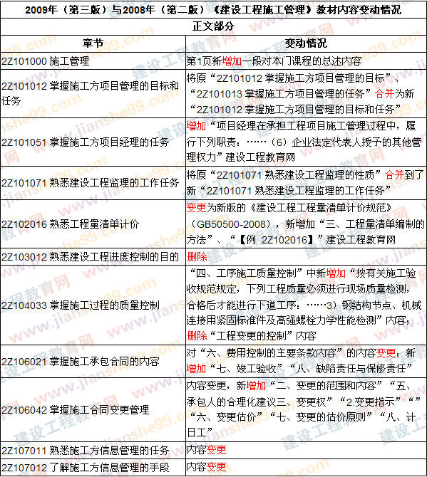 2009版教材将2008版教材的个别章节进行了合并、删除,在“2Z101051 掌握施工方项目经理的任务”、“2Z104033 掌握施工过程的质量控制”、“2Z106021 掌握施工承包合同的内容”、“2Z106042 掌握施工合同变更管理”中的内容进行了补充和完善,对“2Z107011 熟悉施工方信息管理的任务”和“2Z107012 了解施工方信息管理的手段”等章节的内容进行了变更和调整。