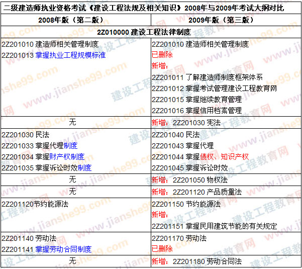 2009年版《建设工程法规及相关知识》大纲与教材的内容相比较2008年版变化不是很大,但也在考试内容上做了一些调整,如删除了建设工程法律制度中删除了执业工程规模标准章节,新增了建造师制度框架体系、建造师考试管理、继续教育管理、信用档案管理等,也新增了宪法相关知识点,并把代理制度的考核点转变为对代理知识的考核,而对财产权制度的考核转变为对债券、知识产权的考核等。来源建设工程教育网,转载请注明出处!