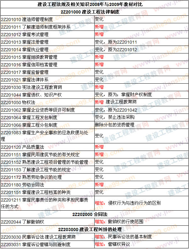 2009版教材增加宪法、物权法和劳动合同法三个法规;删除了执业工程规模标准、劳动合同制度两个内容;建造师相关管理制度中增加了4节的内容;节约能源法中增加了民用建筑节能的有关规定。来源:jianshe99,转载请注明出处!