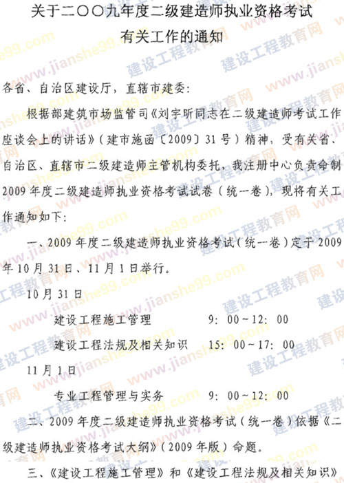 关于2009年度二级建造师执业资格考试有关工作的通知