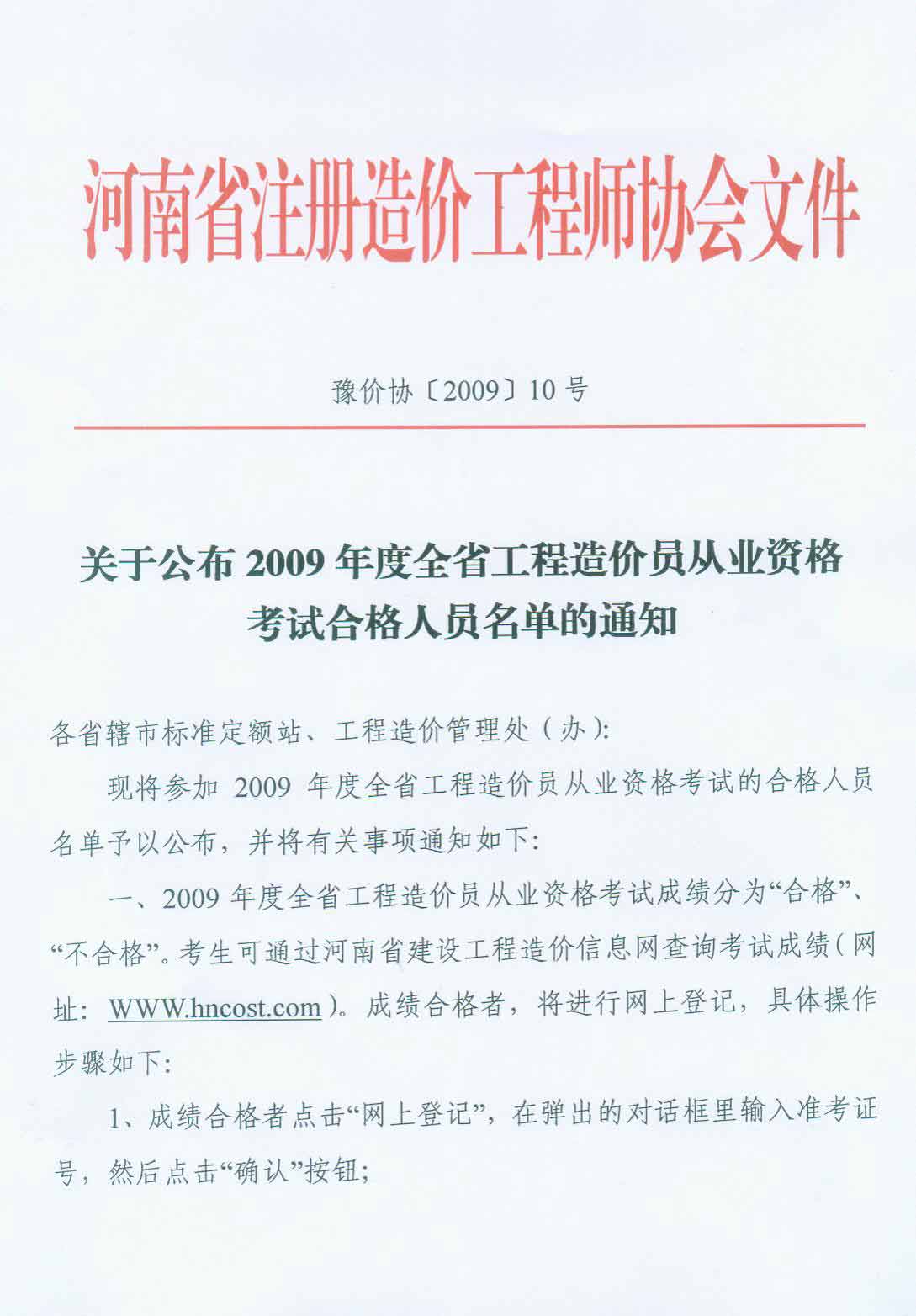 关于公布2009年度全省工程造价员从业资格考试合格人员名单的通知