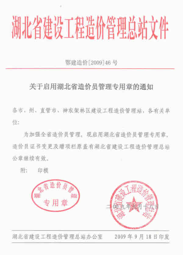关于启用湖北省造价员管理专用章的通知