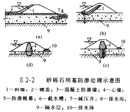 当砾石透水层不厚时,可挖出梯形槽回填黏土成为截水槽,如图8.2-2(d)所示。当透水层较厚时,可用板桩、连续的混凝土排桩和混凝土防渗墙等垂直防渗措施截断透水层,如图8.2-2(b)所示。对于防渗要求较高的砂砾坝基,可用相互搭接的大直径钻孔桩穿过透水层,形成一道连续横向防渗墙,如图8.2-2(c)所示。