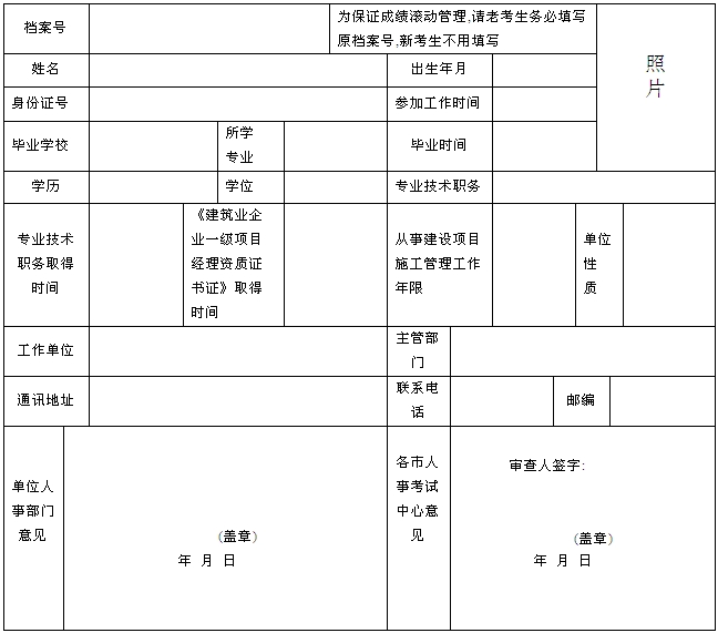 报考人员按要求在网上填报报考信息,上传近期照片,保存提交,通过审核后最晚于6月10日前打印报名表。一级建造师执业资格考试报考人员持打印的报名表2份(在每张报名表右上角粘贴一张备用照片)和相关证件(学历证,从事建设工程项目施工管理工作年限证明,身份证等)原件及复印件一式二份并加盖单位人事部门公章,一级建造师相应专业考试报考人员除需持上述材料外还需携带已取得的一级建造师执业资格证书及复印件,于6月10前到市人力资源和社会保障局职称考试中心进行报名资格审查和现场交费,即完成报名。