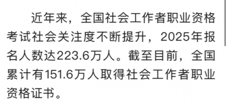 从中社部信息宣传中心了解到,2025年社会工作者考试报名人数高达223.6万人,再创历史新高。截至2025年社工考后,全国累计有151.6万人取得了社会工作者职业资格考试。
