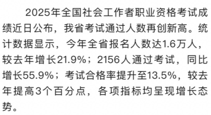 8月份开始,各省市陆续公布了2025年社会工作者考试合格人员数据,从考试合格数据来看,2025年社工考试整体通过率较2024年有所提升!