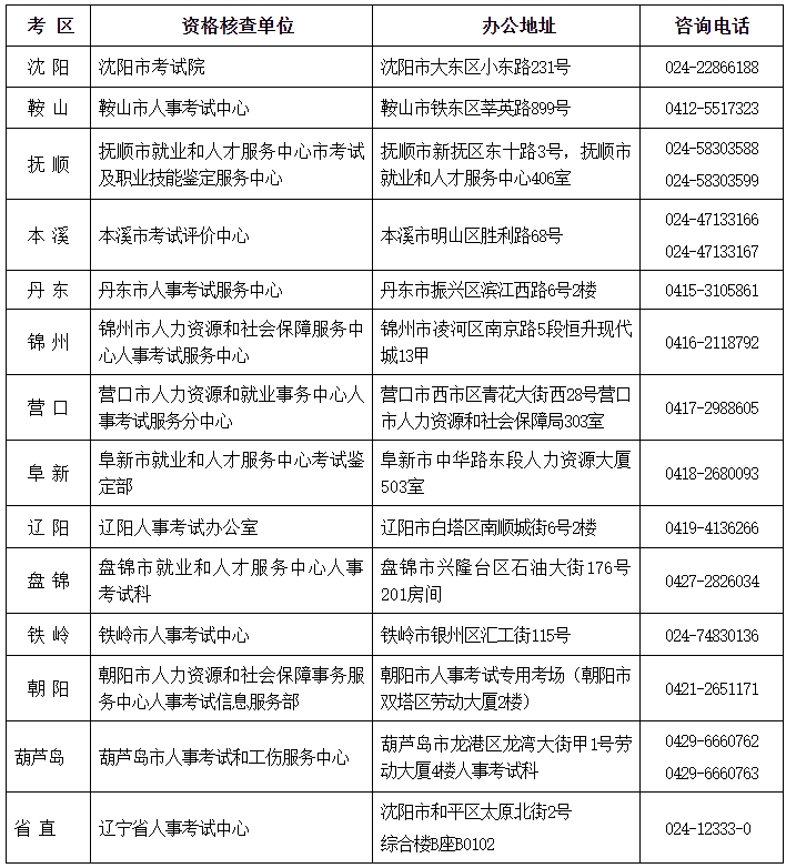 驻沈中、省直单位报考人员核查与监管工作由省人事考试中心负责;其他各市报考人员资格核查与监管工作由所在市人事考试部门负责。全省人事考试资格核查部门咨询电话见附件。