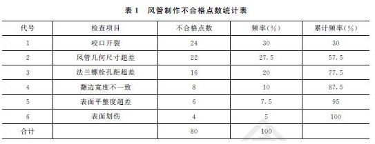 在第一批空调金属风管制作检查中,发现质量问题,项目部采用排列图法对制作中出现的质量问题进行了统计、分析、分类,并建立风管制作不合格点数统计表(见表1),予以纠正处理。经检查,其中风管咬口开裂的质量问题是咬口形式选择不当造成的,经改变咬口形式后,咬口质量得到改进。