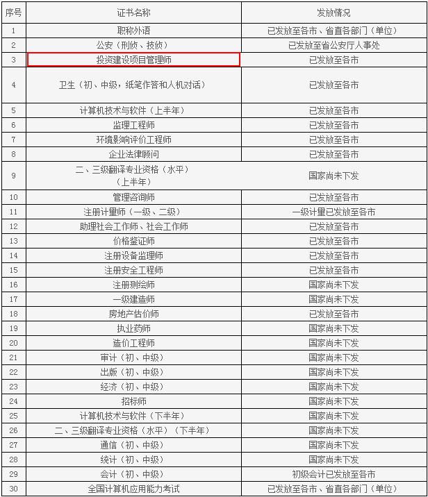 山东人事考试信息网公布2015年度专业技术资格证书发放状态:其中投资建设项目管理师证书已发放至各市,还请及时领取。
