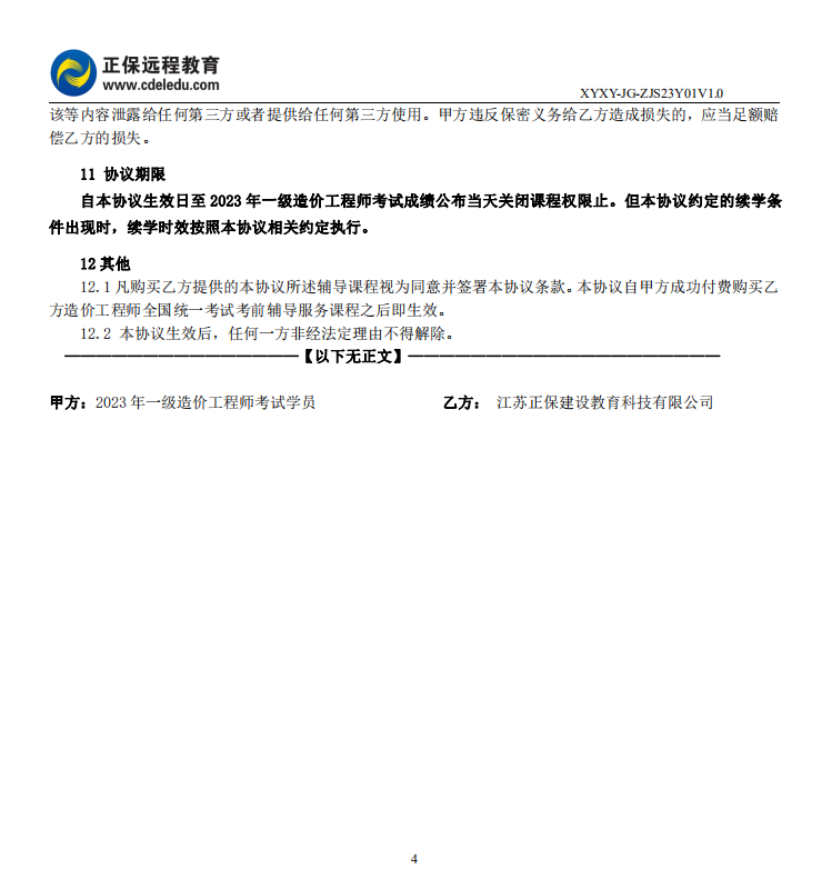 2023一级造价工程师高效实验班(含续学)协议书