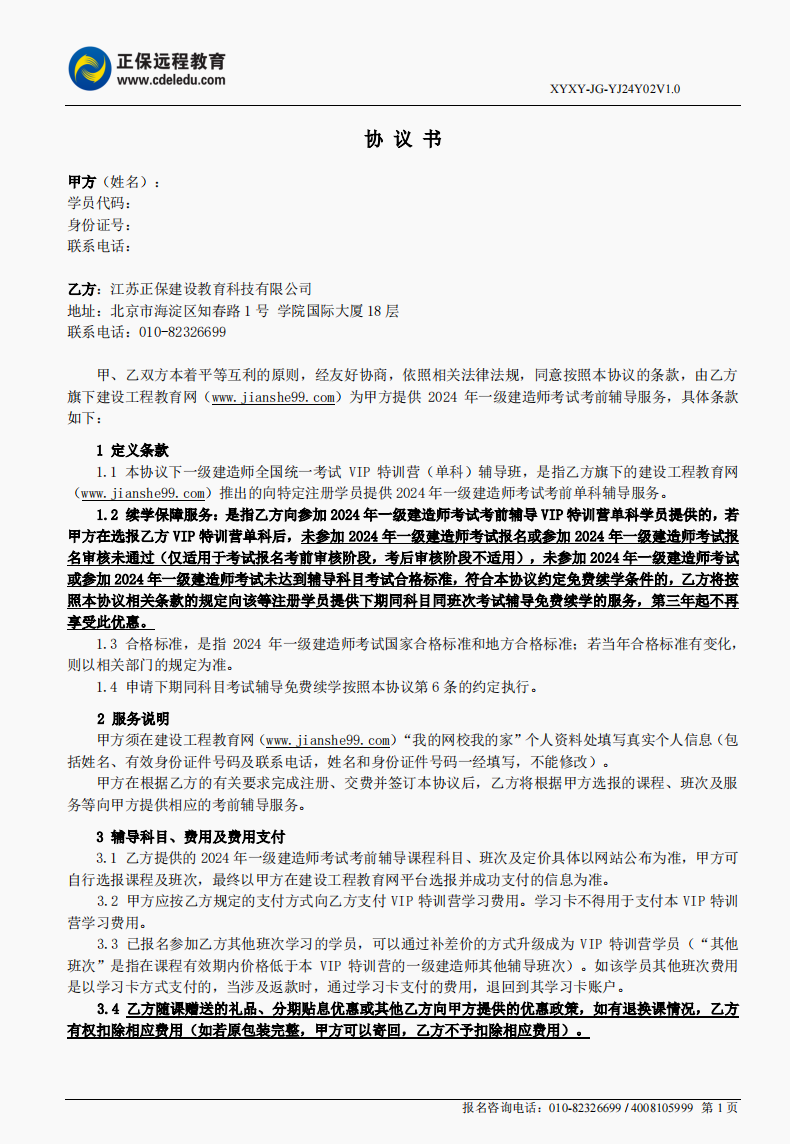 2024年一级建造师VIP特训营(单科)协议书