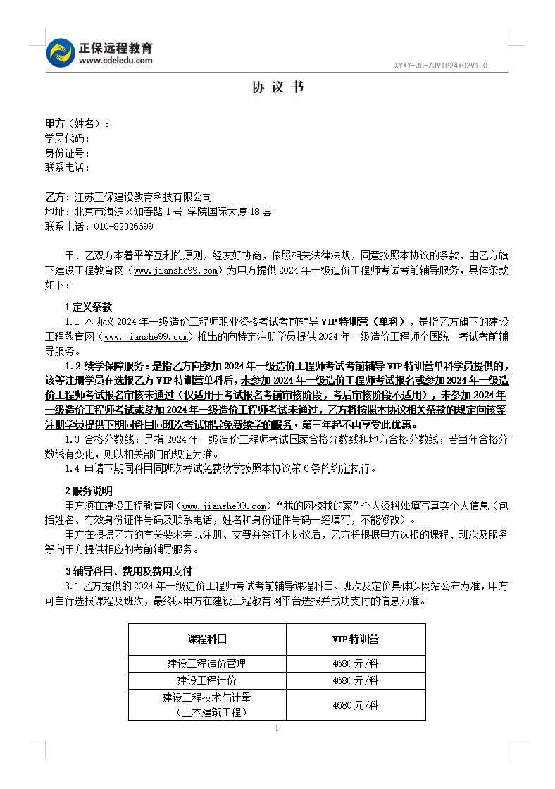 2024一级造价工程师VIP特训营(单科)协议书