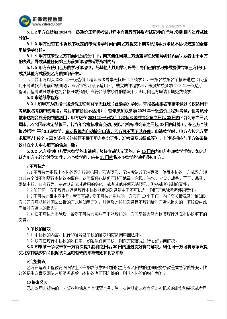 2024一级造价工程师尊享无忧班(含续学)协议书