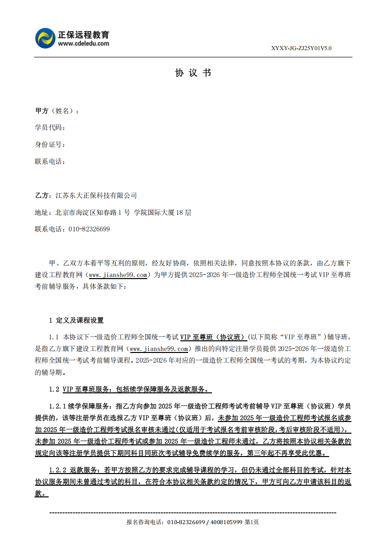 2025一级造价工程师VIP至尊班(协议班)协议书