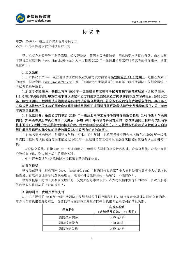 2020年一级注册消防工程师高效实验班协议书
