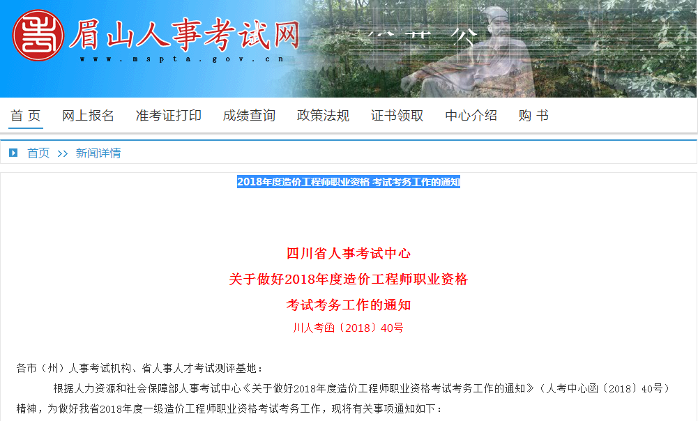 眉山2018年度造价工程师职业资格考试考务工作的通知