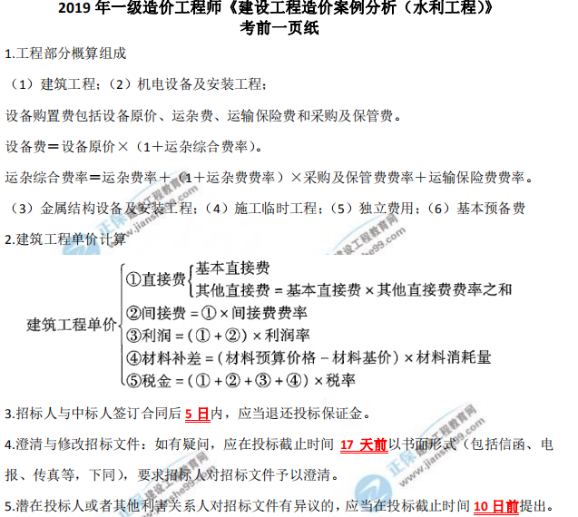 2019年一级造价师考试即将开考,为了帮助考生高效进行考前复习,拿到更多分数,争取顺利备考,建设工程教育网的老师们精心整理了“2019一级造价师考前一页纸”考前必备资料,免费发给大家,领取吧!