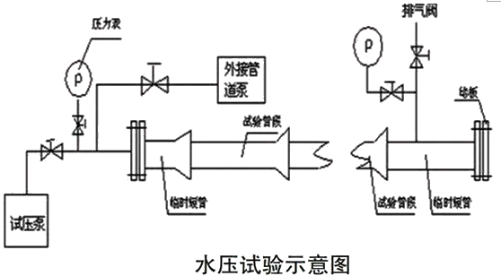 安装试验用的临时注水和排水管线;在试验管道系统的最高点和管道末端安装排气阀;在管道的最低处安装排水阀;压力表应安装在最高点,试验压力以此表为准。