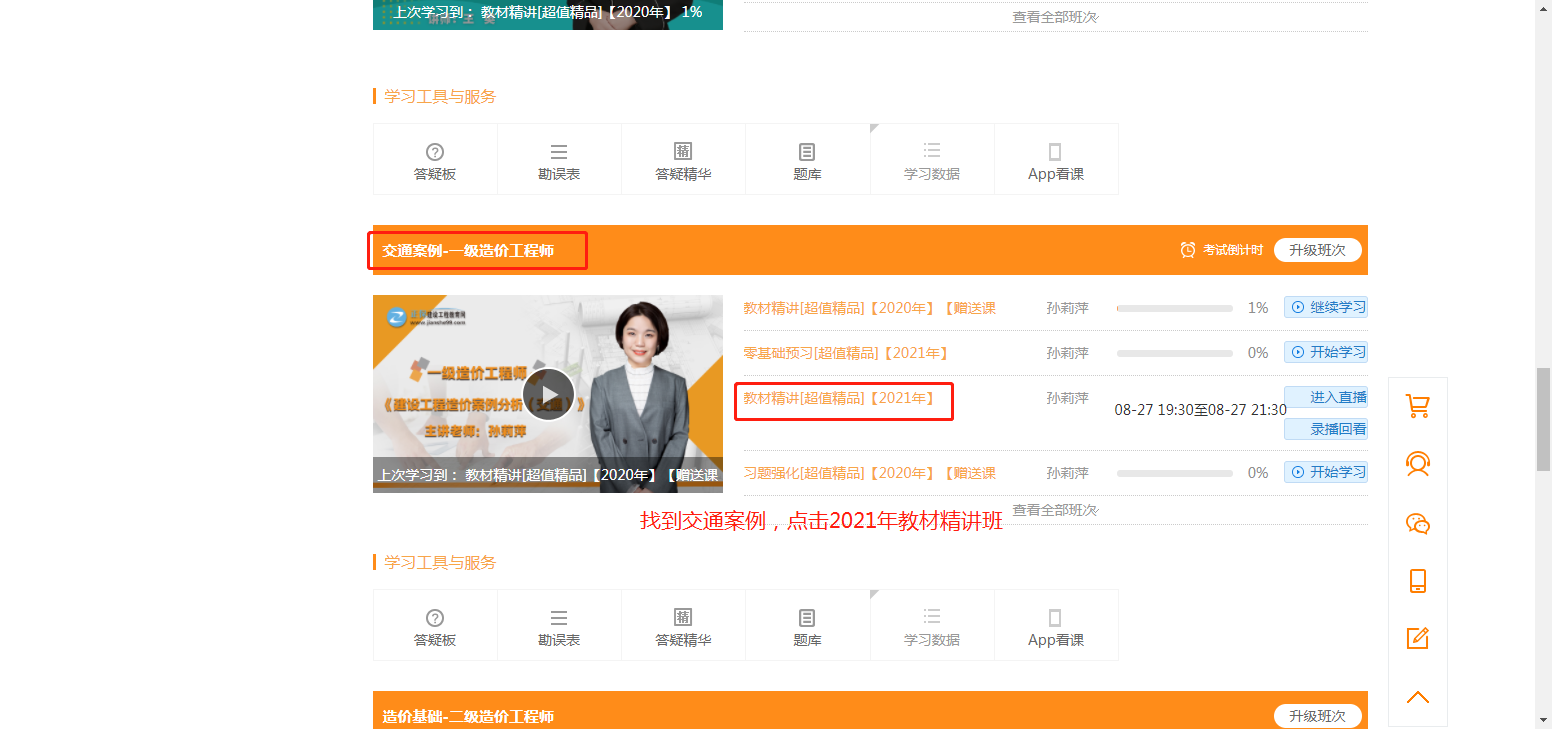 第二步:下拉找到交通案例的课程,点击“教材精讲班【2021】”
