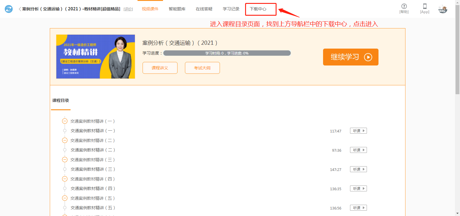 第三步:进入课程目录页面,找到上方导航栏中的“下载中心”,点击进入